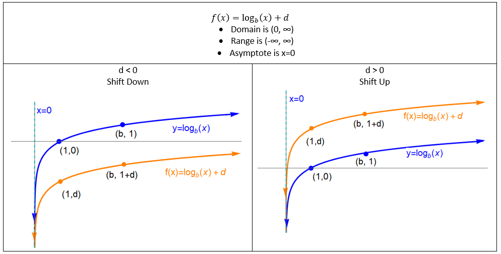 • If \( \mathrm{0<b<1} \), the function decreases without bound as \( \mathrm{x\to\infty} \)