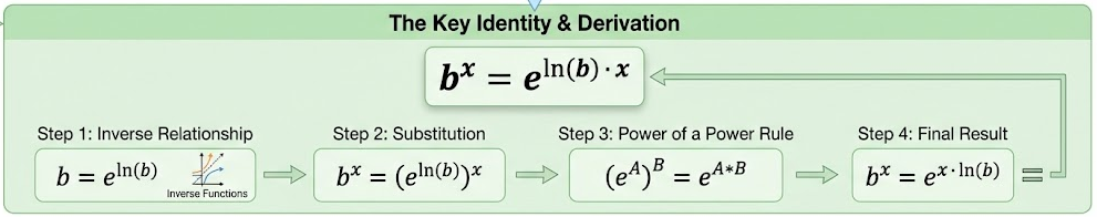 \( \mathrm{ \displaystyle b^x = e^{(\log_e b)x} } \)