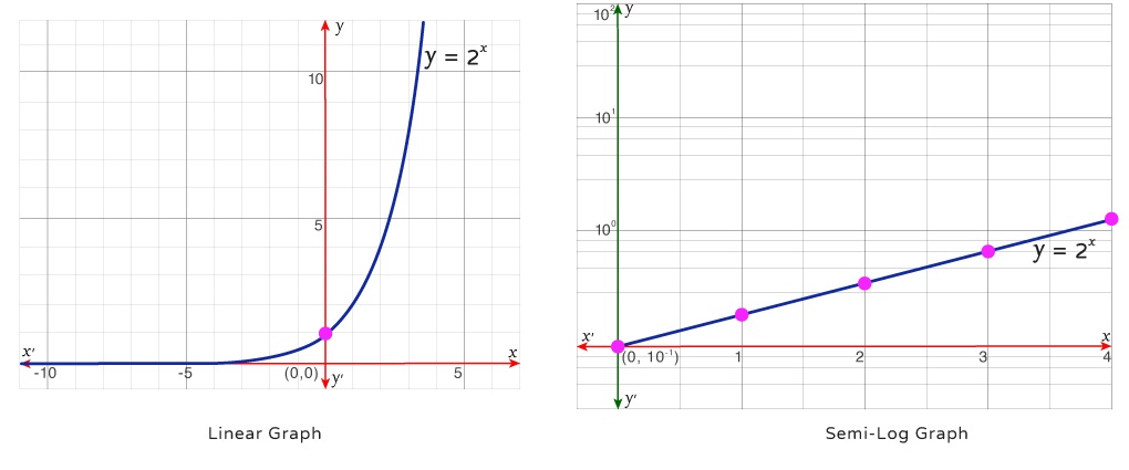 When the y-axis is logarithmically scaled and the x-axis is linear, functions or data sets that demonstrate exponential behavior appear as straight lines.
