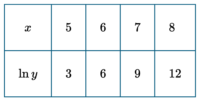 (D) \[\begin{array}{c|c} x & \ln y \\ \hline 5 & 50 \\ 6 & 60 \\ 7 & 70 \\ 8 & 80 \\ \end{array}\]