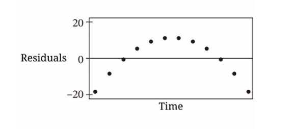 A food vendor developed a new sandwich type for sale. The vendor made estimates about the sales of the new sandwich type over time. A linear regression was used to develop a model for the sales over time. The figure shows a graph of the residuals of the linear regression. Which of the following statements about the linear regression is true?