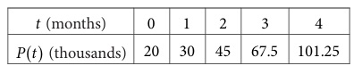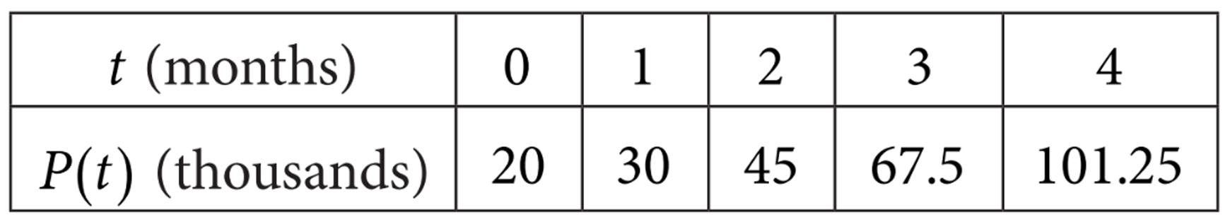 | \( P(t) \) (thousands) | 20 | 30 | 45 | 67.5 | 101.25 |