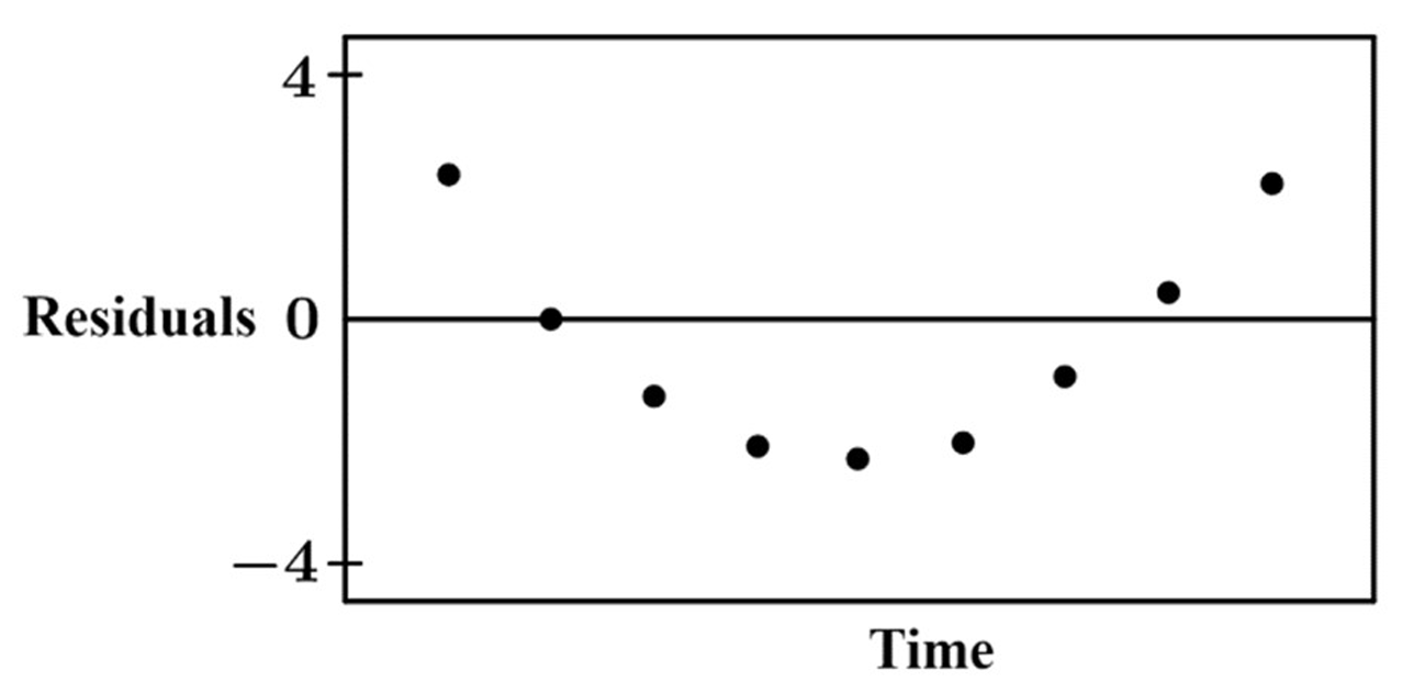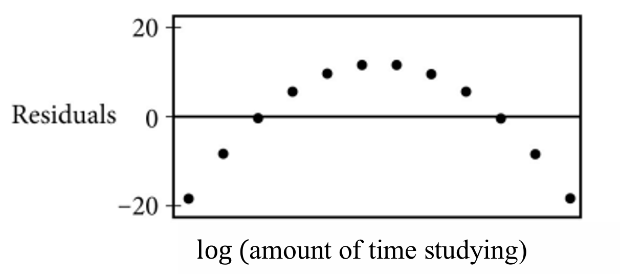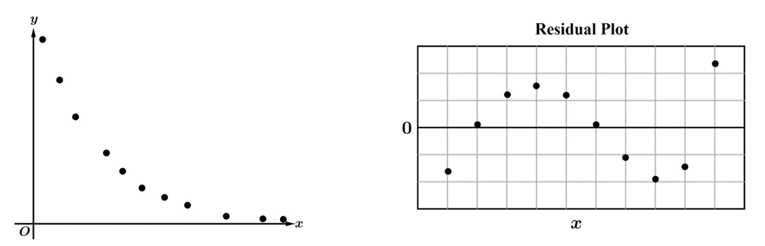 The residual plot shows a distinct curved, non-random pattern (a “U” or “inverted U” shape).