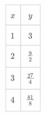 Constant ratio ⇒ exponential growth with base \( b = 1.5 = \frac{3}{2} \).