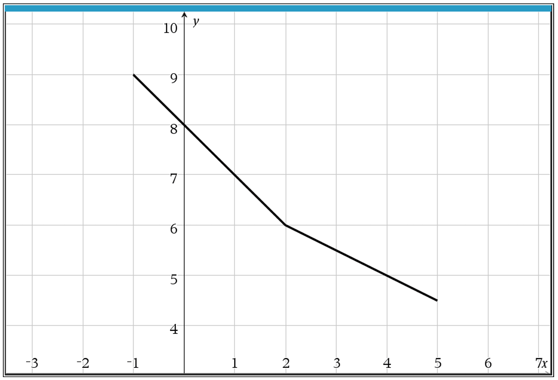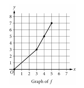 From the graph, \( f \) is increasing and its maximum output is \( y = 7 \) at \( x = 5 \) (endpoint).