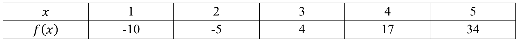Calculate the first differences of \(f(x)\): \((-5) – (-10) = 5\), \(4 – (-5) = 9\), \(17 – 4 = 13\), \(34 – 17 = 17\).