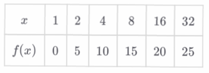 As the output $f(x)$ increases by a constant $5$ ($0, 5, 10, 15 \dots$),