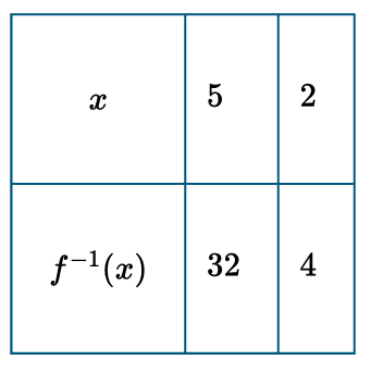 The table gives values for the invertible function $y = f(x)$ for selected values of $x$. Which of the following input-output pairs describes $f^{-1}$?