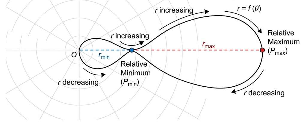 A polar function increases for \( 0 \le \theta \le \dfrac{\pi}{2} \) and decreases for \( \dfrac{\pi}{2} \le \theta \le \pi \).