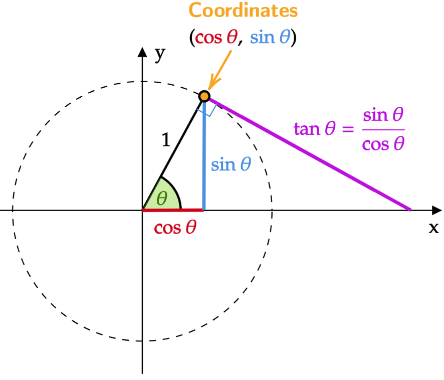 \( \tan \theta = \dfrac{\sin \theta}{\cos \theta} \), provided \( \cos \theta \ne 0 \)