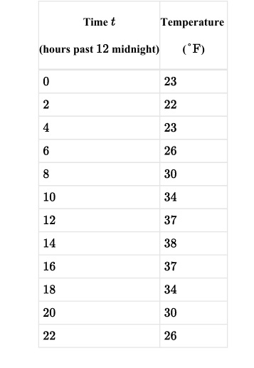 and the minimum temperature is \(22^\circ\mathrm{F}\) at \(t = 2\).