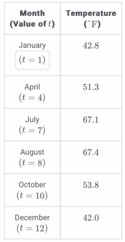 The model is \(F(t) = 8\cos\left(\dfrac{\pi}{12}(t + c)\right) + 30\).