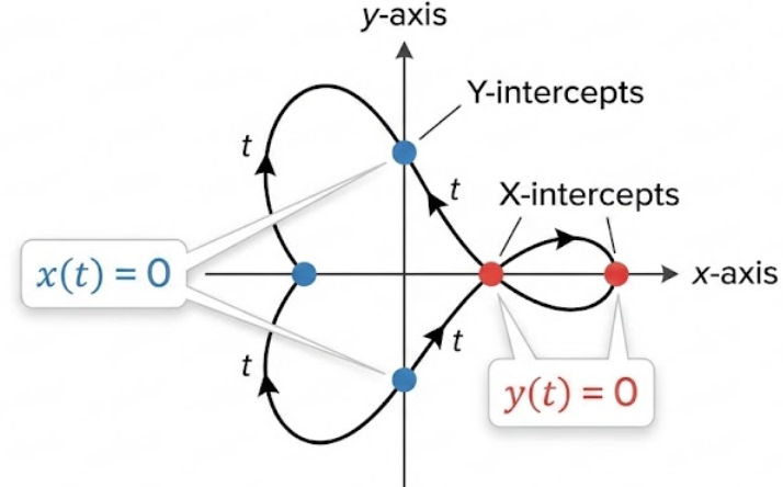 Because parametric curves may pass through the same intercept at multiple parameter values, each real zero of \( x(t) \) or \( y(t) \) must be checked within the given domain of \( t \).