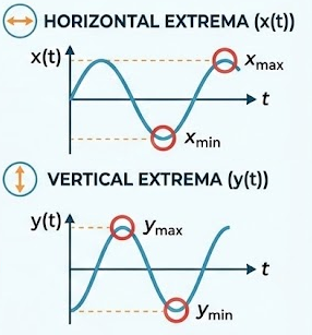 the horizontal extrema of the motion correspond to the maximum and minimum values of \( x(t) \), and the vertical extrema correspond to the maximum and minimum values of \( y(t) \).