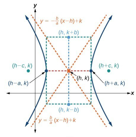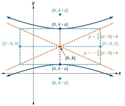 Asymptotes: \( y – k = \pm \dfrac{b}{a}(x – h) \)