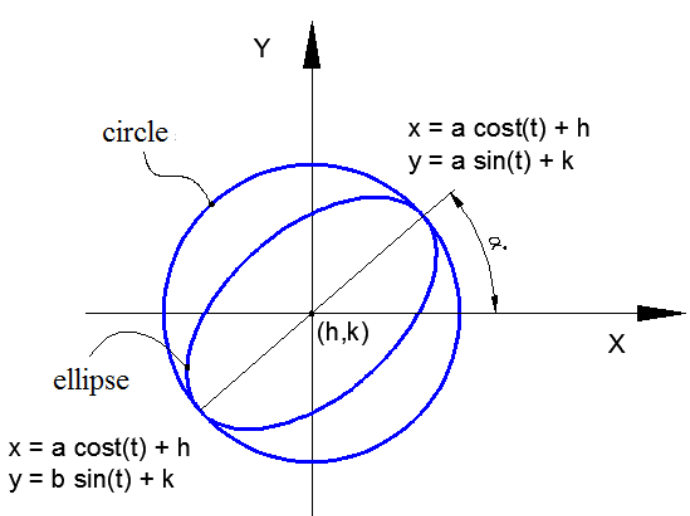 \( x(t) = h + a\cos t,\quad y(t) = k + b\sin t \)
