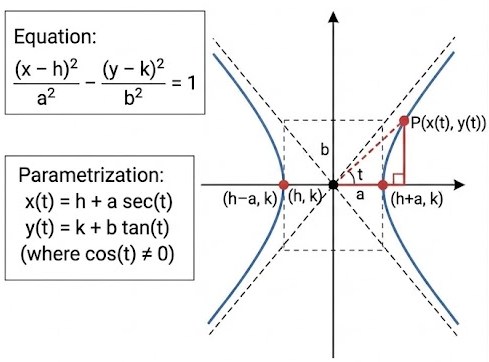 The specific parametrization depends on whether the hyperbola opens left and right or up and down.