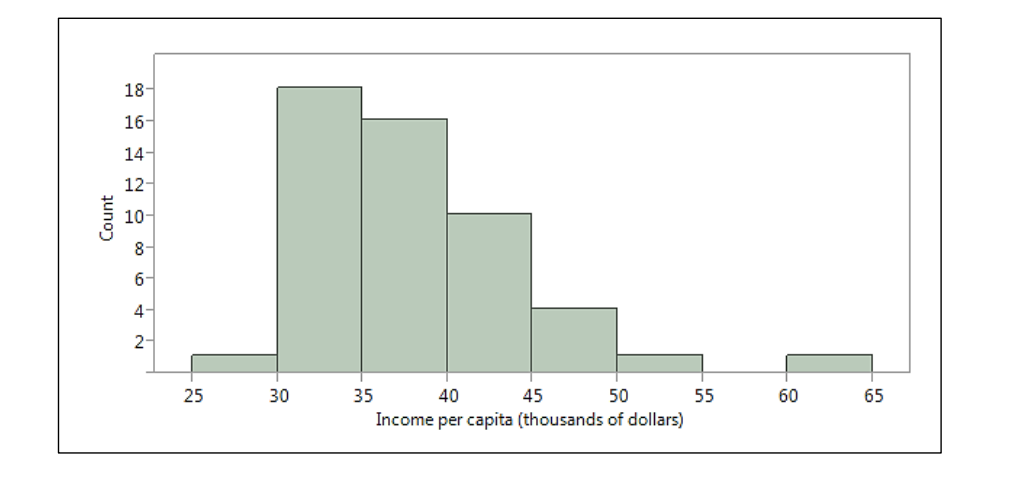 The histogram below summarizes the distribution of personal income per capita (in thousands of dollars) for each of the \(50\) states and the District of Columbia.