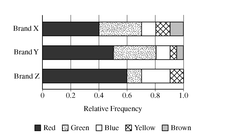 Three brands of candy pieces—X, Y, and Z—are made in many colors. Shaela bought one bag of each brand and counted the number of pieces of each color. The graph below shows the relative frequency distribution of the colors for each bag.