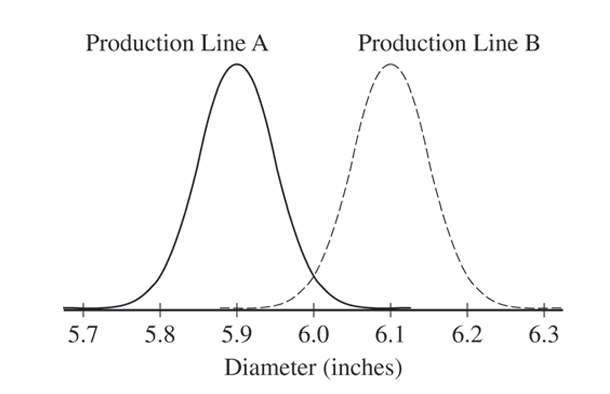 Explanation: Sample means from Method 1 will cluster tightly around \(6\) inches (small \(\sigma_{\bar{x}}\)). Sample means from Method 2 will cluster around \(5.9\) inches about half the time and around \(6.1\) inches the other half, resulting in a much wider spread of the \(365\) sample means.