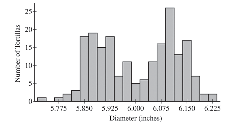 Method 1 was likely used. The histogram is bimodal, suggesting the sample contains tortillas from both production lines (centered near \(5.9\) and \(6.1\) inches). Method 2 would likely produce a unimodal histogram.