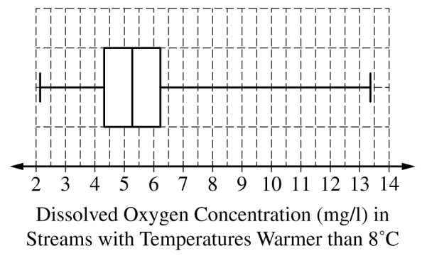 • Fences for outliers (not drawn, but for reference): lower \( Q_1 – 1.5\mathrm{IQR} = 4.39 – 1.5(1.73) = 1.885 \) (so \( 2.10 \) is not beyond the fence); upper \( Q_3 + 1.5\mathrm{IQR} = 6.12 + 1.5(1.73) = 8.715 \) (values above this would be flagged, but the instruction says not to indicate outliers).