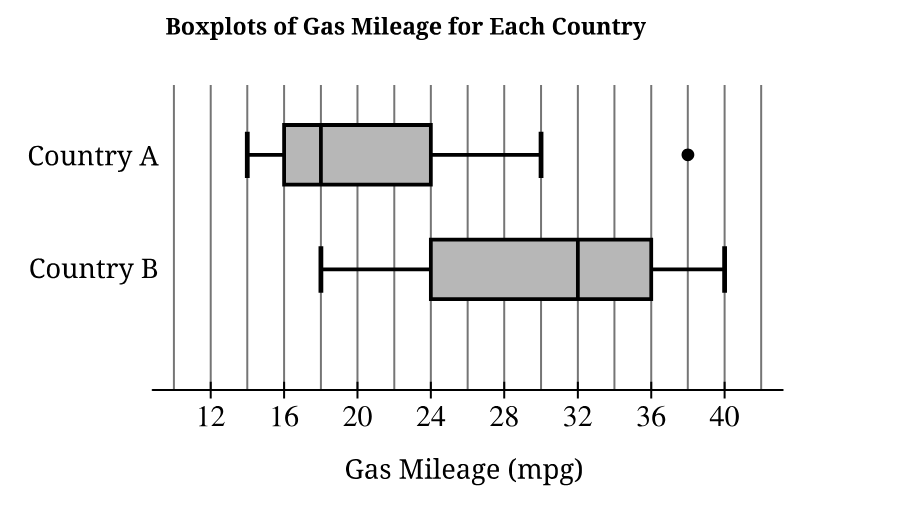 – Center: The distribution of gas mileage for Country A has a lower center than Country B. The median gas mileage for Country A (approximately \(18\) mpg) is significantly lower than the median for Country B (approximately \(32\) mpg).