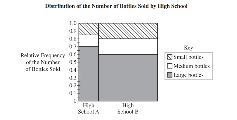 Justification: The proportion is represented by the height of the segment. The segment for “Large bottles” is taller for High School A (from \(0.7\) to \(1.0\), a height of \(0.3\)) than for High School B (from \(0.6\) to \(0.8\), a height of \(0.2\)).
