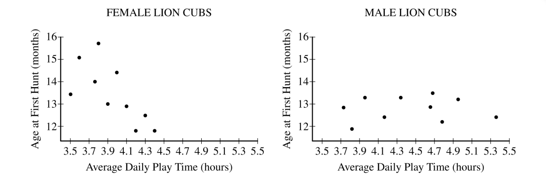 – **Female Lion Cubs:** The scatterplot shows a clear negative trend. As the average daily play time increases, the age at first hunt tends to decrease.