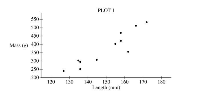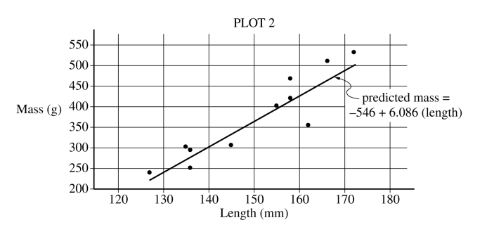 (ii) The least-squares regression line overestimates the mass of this bullfrog. This is evident because the point for this bullfrog is below the regression line in Plot 2, meaning the actual mass is less than the predicted mass.