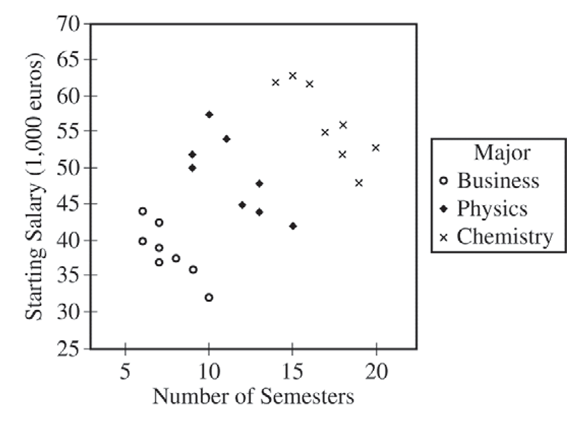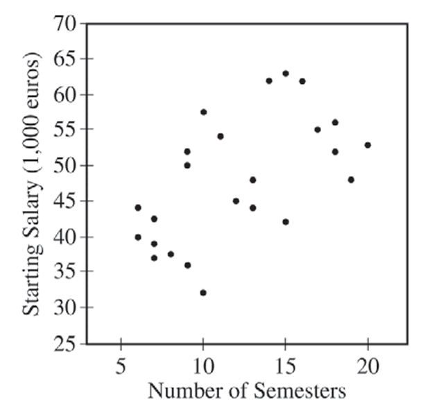 A newspaper in Germany reported that the more semesters needed to complete an academic program at the university, the greater the starting salary in the first year of a job. The report was based on a study that used a random sample of \(24\) people who had recently completed an academic program. Information was collected on the number of semesters each person in the sample needed to complete the program and the starting salary, in thousands of euros, for the first year of a job. The data are shown in the scatterplot below.