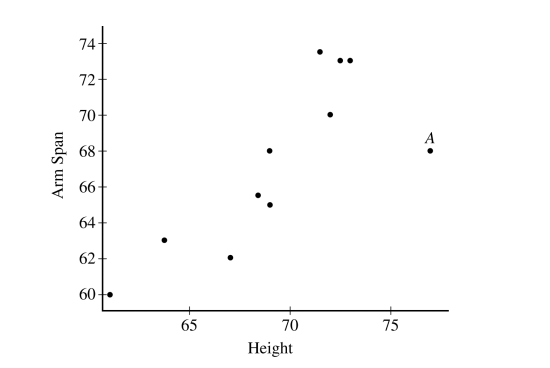 Point A is an influential point. It has a high x-value (height) but a y-value (arm span) that is much lower than the general positive trend of the other points.