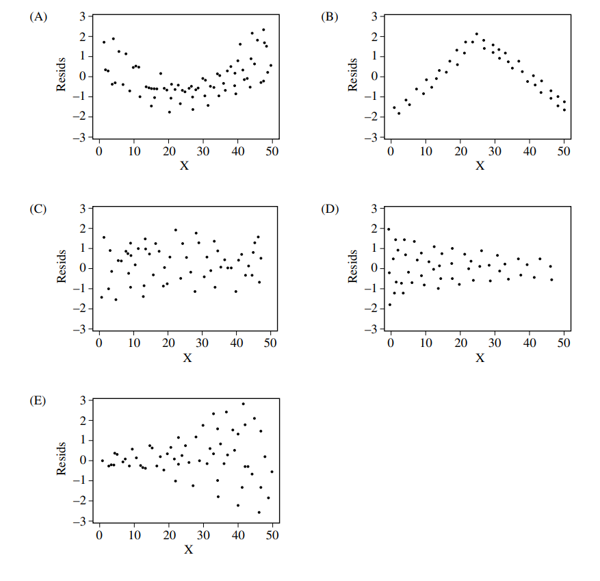 – Plot (C) is the only plot that shows a random, formless scatter of points centered around \(0\) with roughly constant variance. This is the ideal appearance for a residual plot, indicating that the linear model is appropriate.