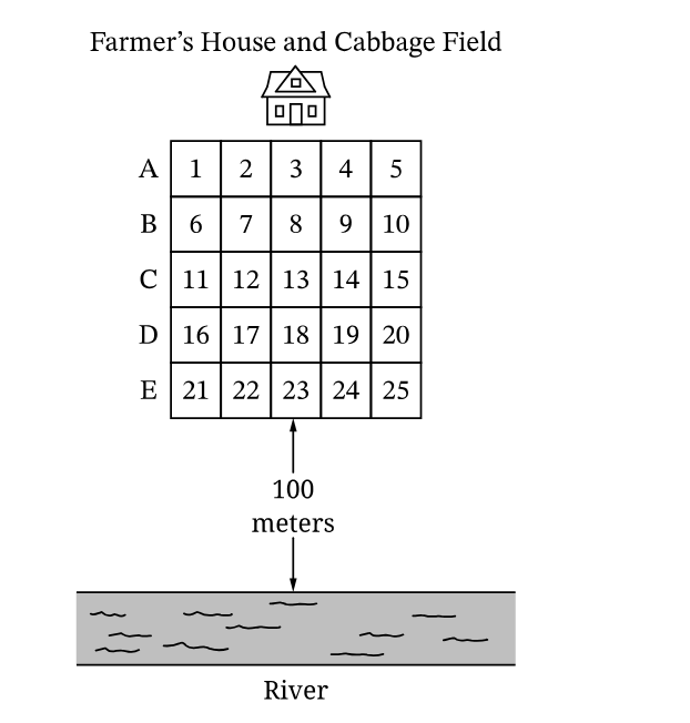 Aphids are tiny insects that feed on plants such as cabbage plants. A farmer wants to reduce the number of aphids in a cabbage field. A river is located \(100\) meters south of the cabbage field. The farmer divides the field into \(25\) regions of equal size, as shown in the diagram. Each region has approximately the same number of cabbage plants.
