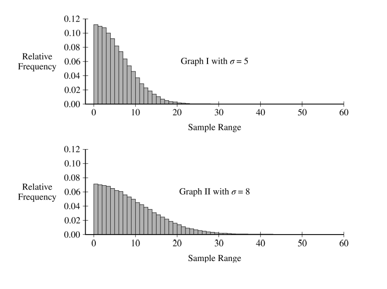 (i) Describe the sampling distribution of the sample range for random samples of size \(n=2\) from a normal distribution with standard deviation \(\sigma=5\), as shown in Graph I.
