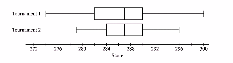 Since both medians are less than \(288\), it means that for both tournaments, at least \(50\%\) (half) of the golfers had scores at or below the median, which is a value less than \(288\). Therefore, this statement must be true. The other statements make claims about sample size or specific values that cannot be confirmed from a boxplot.