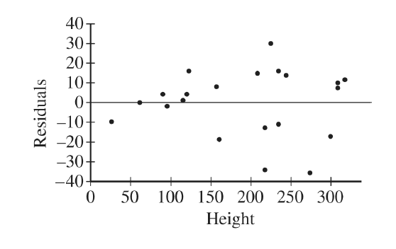 From the plot, residuals for heights below about \(125\) feet cluster close to \(0\), while for larger heights the residuals show much greater spread (both positive and negative).