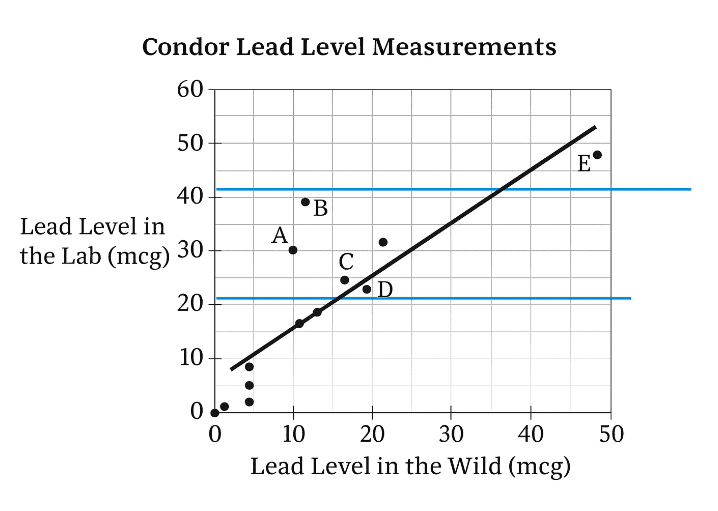 The California condor is an endangered species. A biologist measured the lead level (in micrograms, mcg) for \(14\) California condors in the wild and in the lab. The scatterplot of lab lead level (response) versus wild lead level (explanatory) and the least-squares regression line for predicting the lab level from the wild level are shown. Five points are labeled \(A,B,C,D,E\).