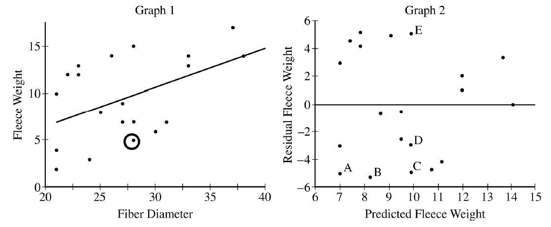 Data were collected on the fiber diameter and the fleece weight of wool taken from a sample of \(20\) sheep. The data are shown in the following graphs. Graph 1 is a scatterplot of fleece weight versus fiber diameter with the respective least-squares regression line shown. Graph 2 is the associated plot of the residuals versus the predicted values.