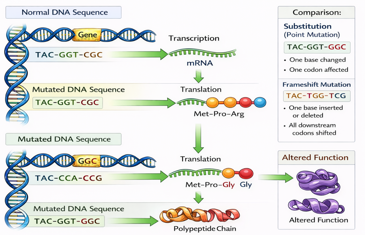 b. A change in a DNA sequence occurs when a nucleotide is substituted into the original sequence (causing a point mutation) or inserted into or deleted from the sequence (causing a frameshift mutation).