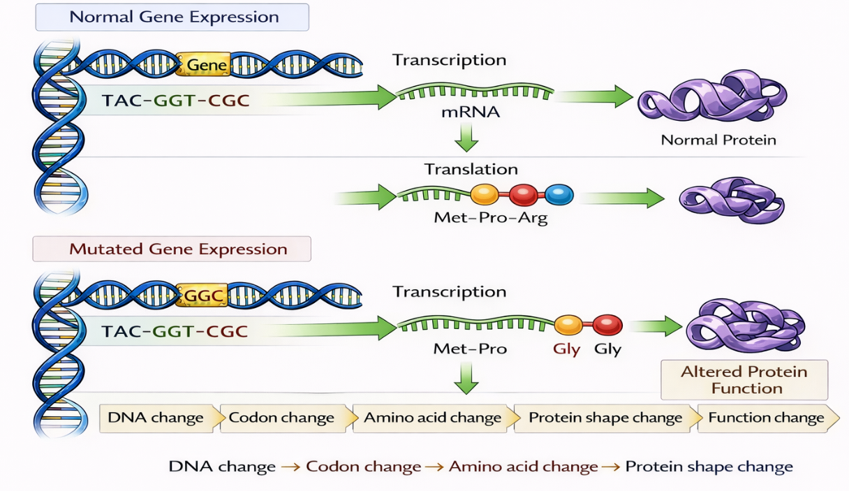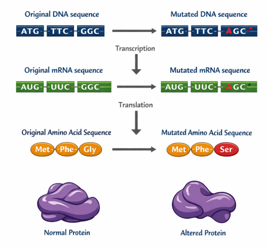 DNA sequence change → mRNA codon change → Amino acid change → Protein structure change → Functional consequence → Phenotype impact