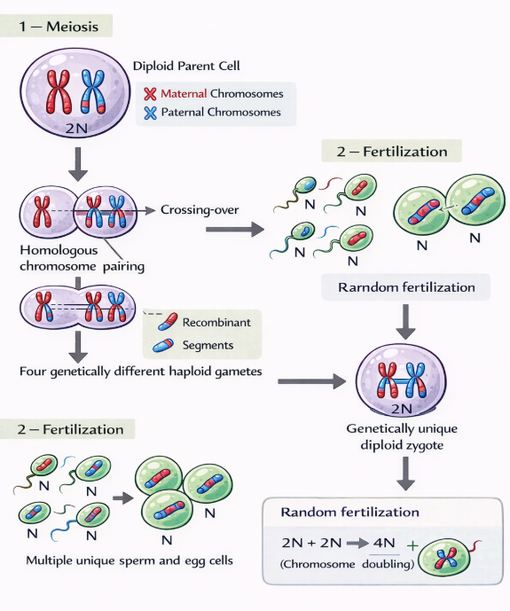 | Fertilization | Random fusion of gametes |