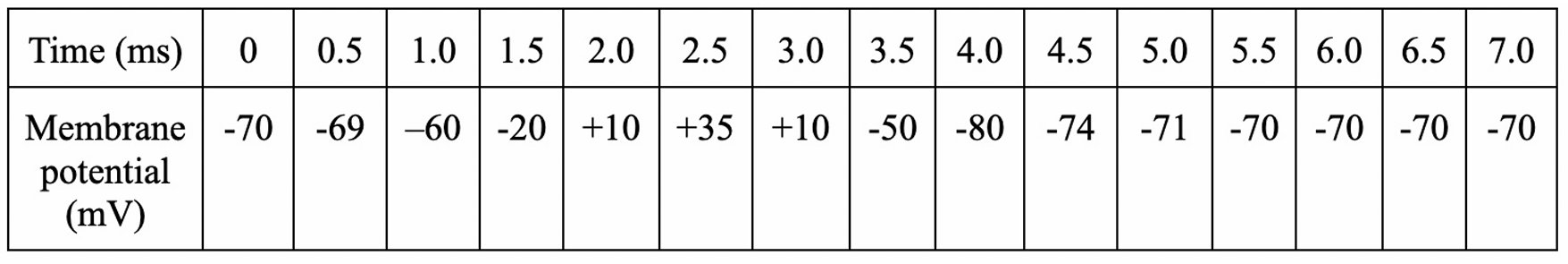Action potential is important for the movement of electrochemical impulses along a neuron. A series of action potentials along a neuron is what makes up a nerve impulse. Changes in electrical potential between the inside and outside of the cell membrane of the axon within the neuron have been recorded in the table below over (5.0) milliseconds (ms).