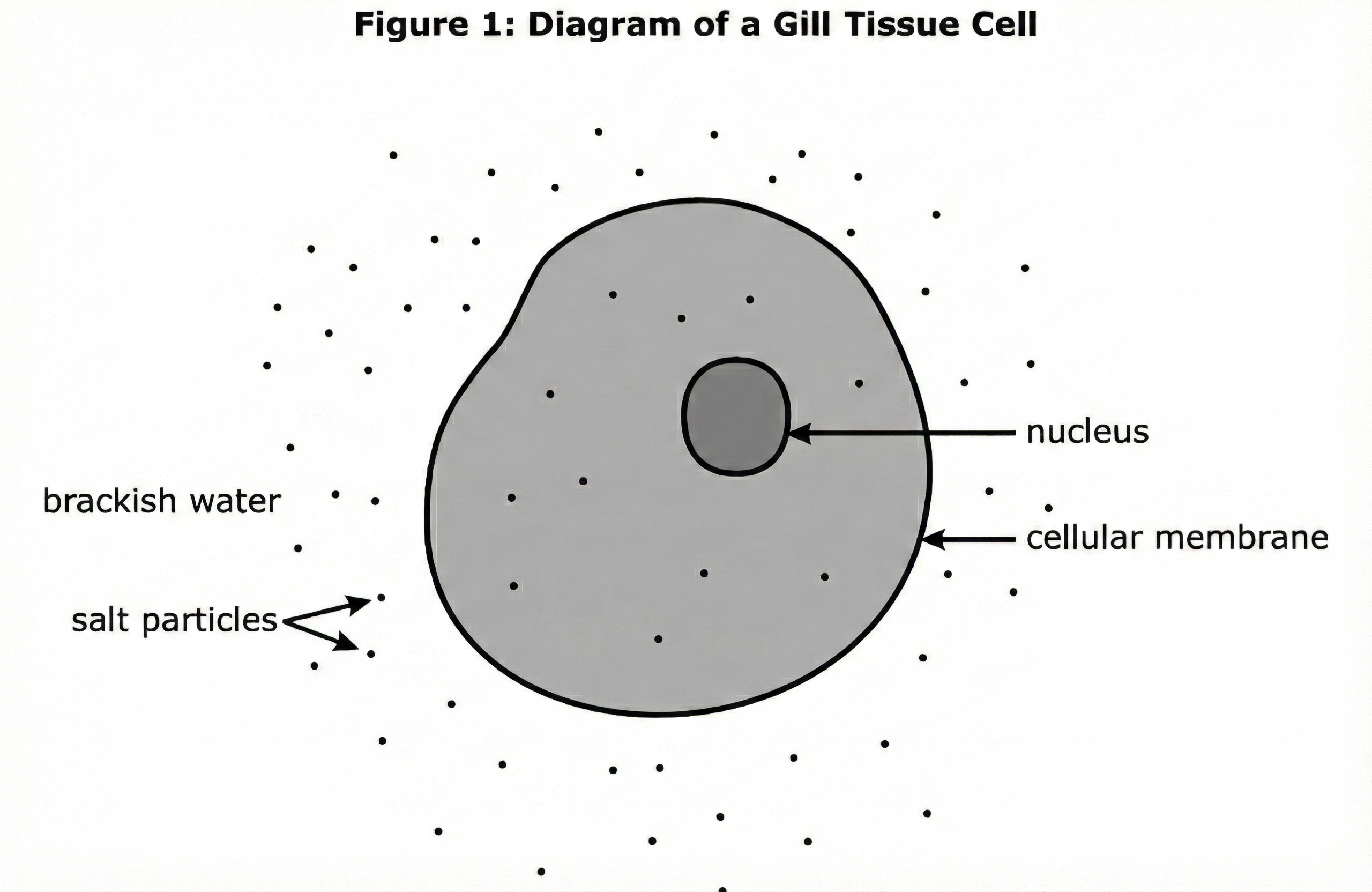 An estuary is a brackish water environment. Salinity changes in response to tidal changes. At high tide, the estuary is filled with more ocean water, and the salinity increases. The salinity decreases at low tide, when the ocean waters recede and fresh water from the mouth of the river is allowed in. Organisms that live in this environment are specially adapted for constantly changing salinity levels. When the salinity of the water changes, the cells of the organisms that live there must adjust by either taking in water or releasing it. Figure 1 represents a cell from the gill tissue of a finger mullet in a high-salinity environment.