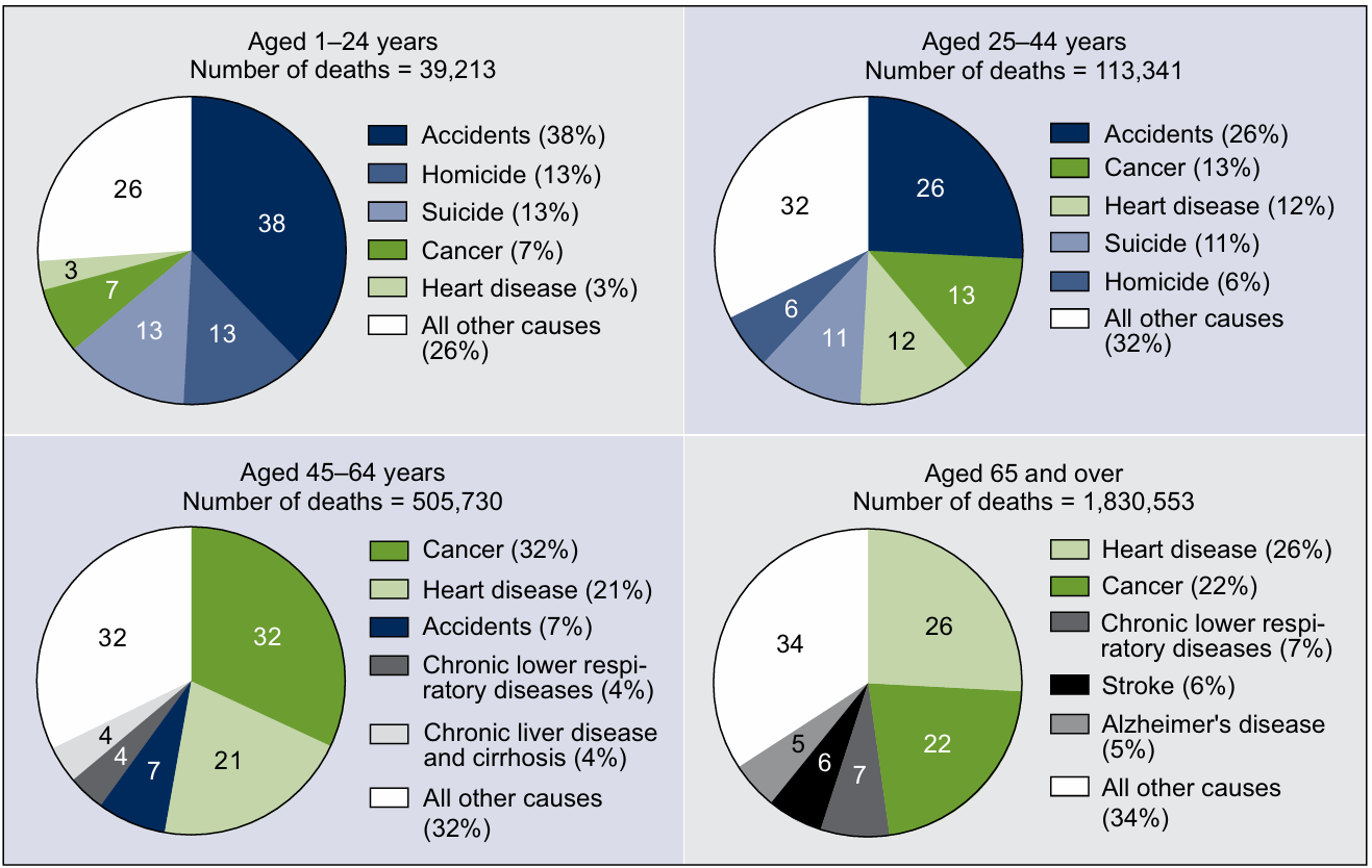 Other causes like Homicide and Suicide follow at \(13\%\) each.