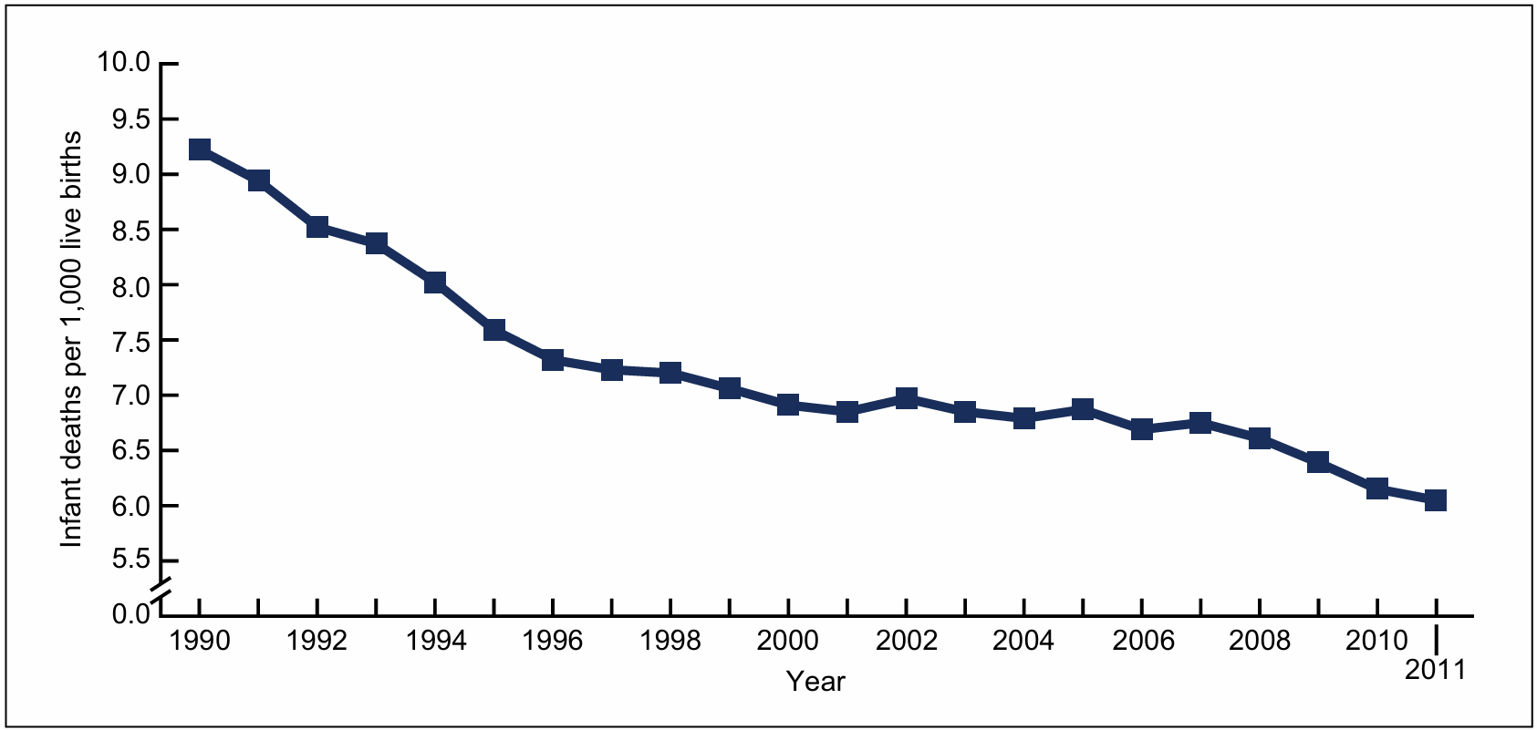 In Figure 5, the $y$-axis is explicitly labeled “Infant deaths per $1,000$ live births.”