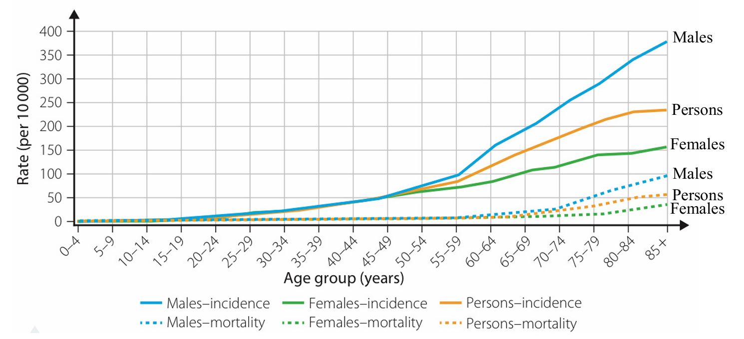 Follow the vertical grid line up to the solid blue line representing males-incidence.