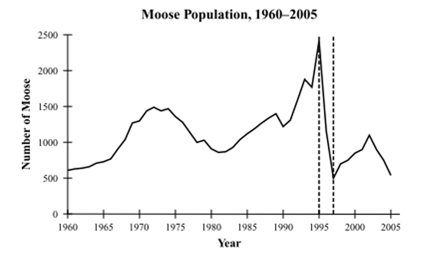 The population of the moose dramatically decreased (crashed) from (1995) to (1997), dropping from approximately (2400) individuals to roughly (500). Regarding the rates: the death rate increased significantly and exceeded the birth rate. While the absolute number of births decreased because there were fewer surviving adults to reproduce, the defining characteristic of this decline is that mortality (death rate) was much higher than natality (birth rate).
