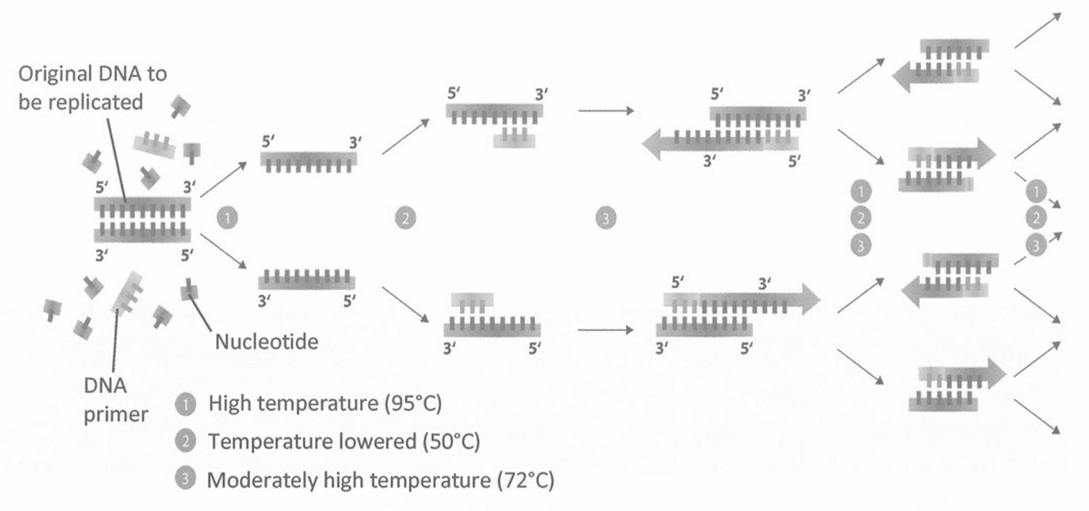 The diagram below shows a common lab process used to amplify DNA fragments called Polymerase Chain Reaction. The process uses heat resistant DNA polymerase enzyme from Thermus aquaticus bacterium, nucleotides, DNA primer and the template DNA. The materials undergo a heating and cooling process to produce many identical copies of the DNA fragment.