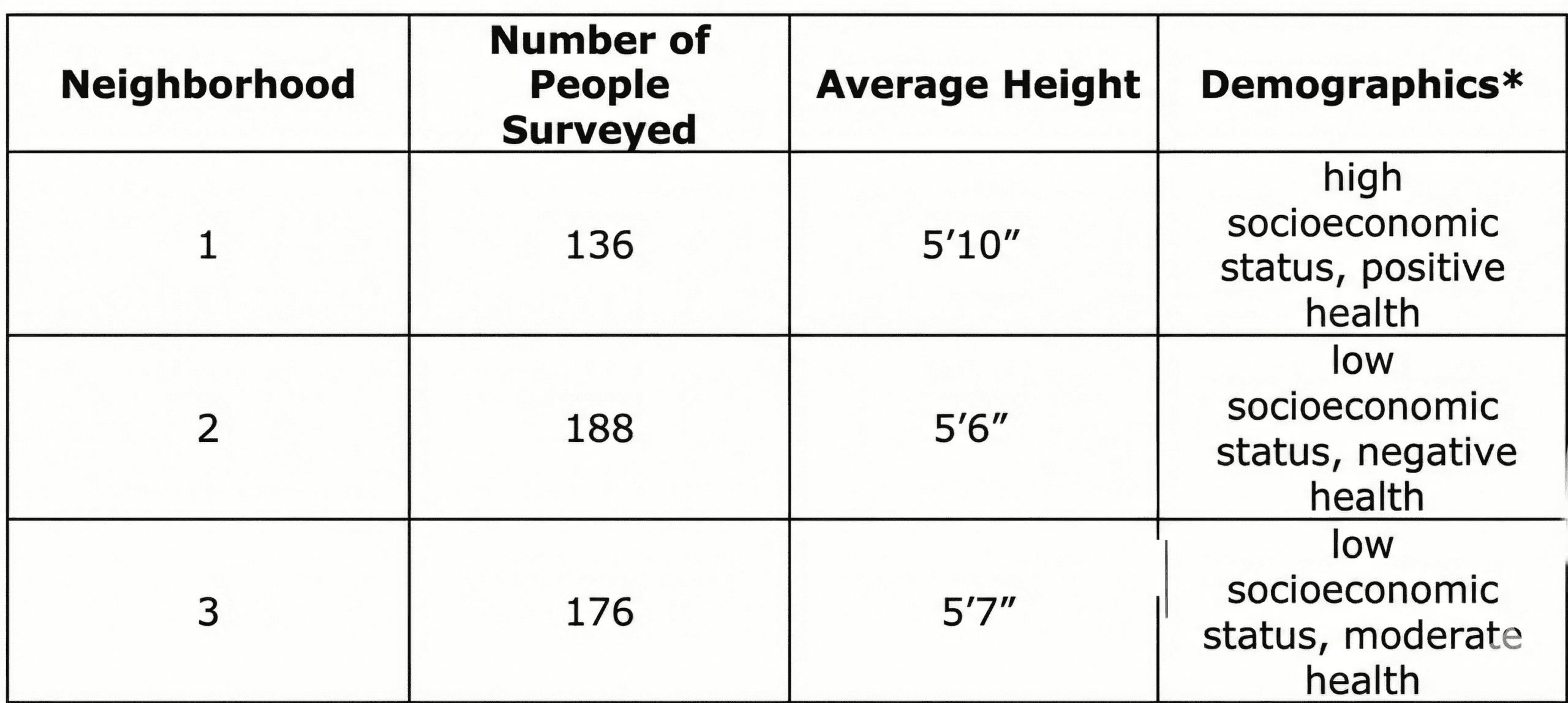 Q. Judd visits an exhibit at a local museum. A display there describes a recent research study where people from several distinct neighborhoods in a large U.S. city were surveyed for height. The display features the data table below.